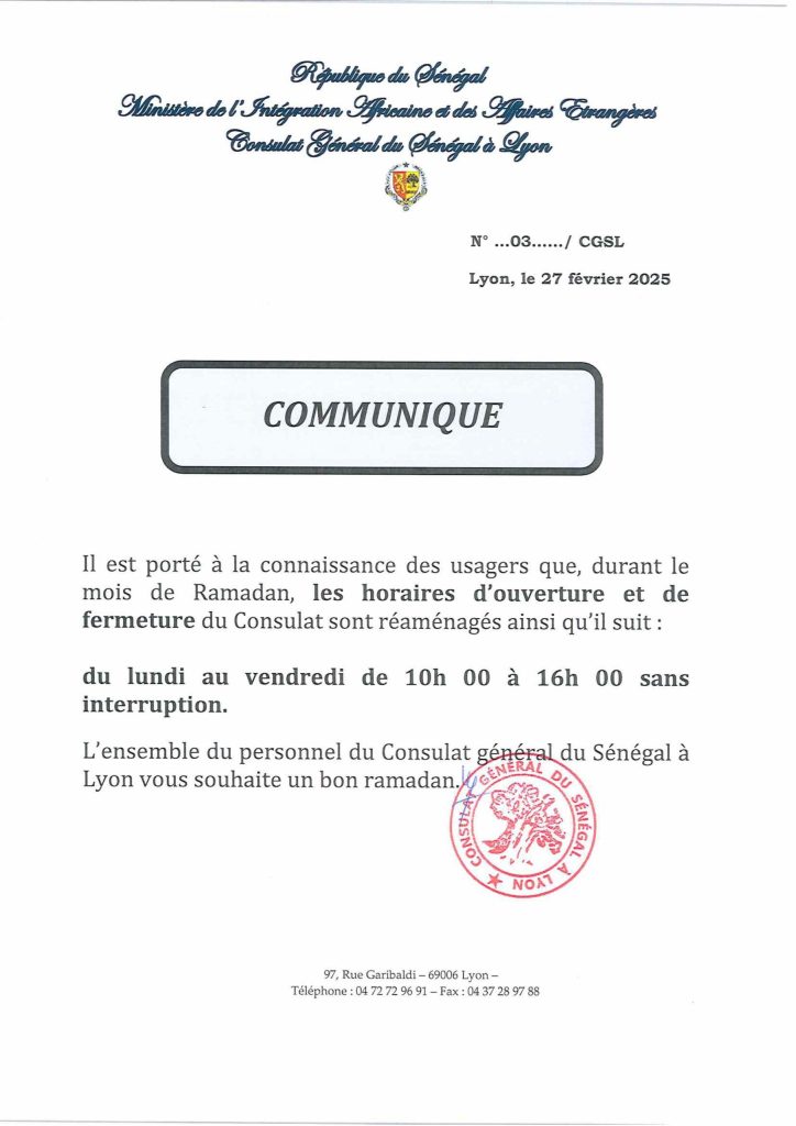 Communiqué du Consulat général du Sénégal à Lyon portant information de la communauté sénégalaise sur l'organisation des services consulaires.